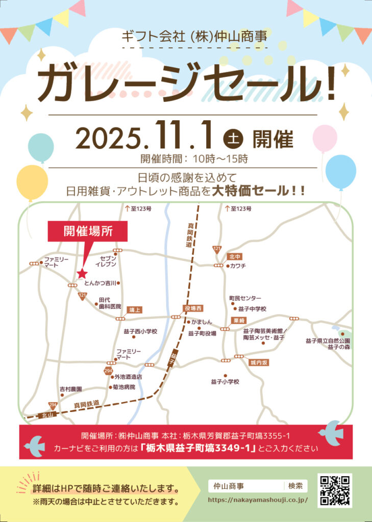 2025年11月1日(土)に仲山商事本社にてガレージセールを開催いたします。