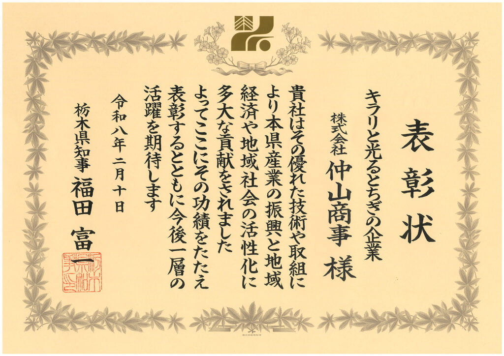 この度、福田富一栃木県知事より「キラリと光るとちぎの企業」として表彰いただきました。